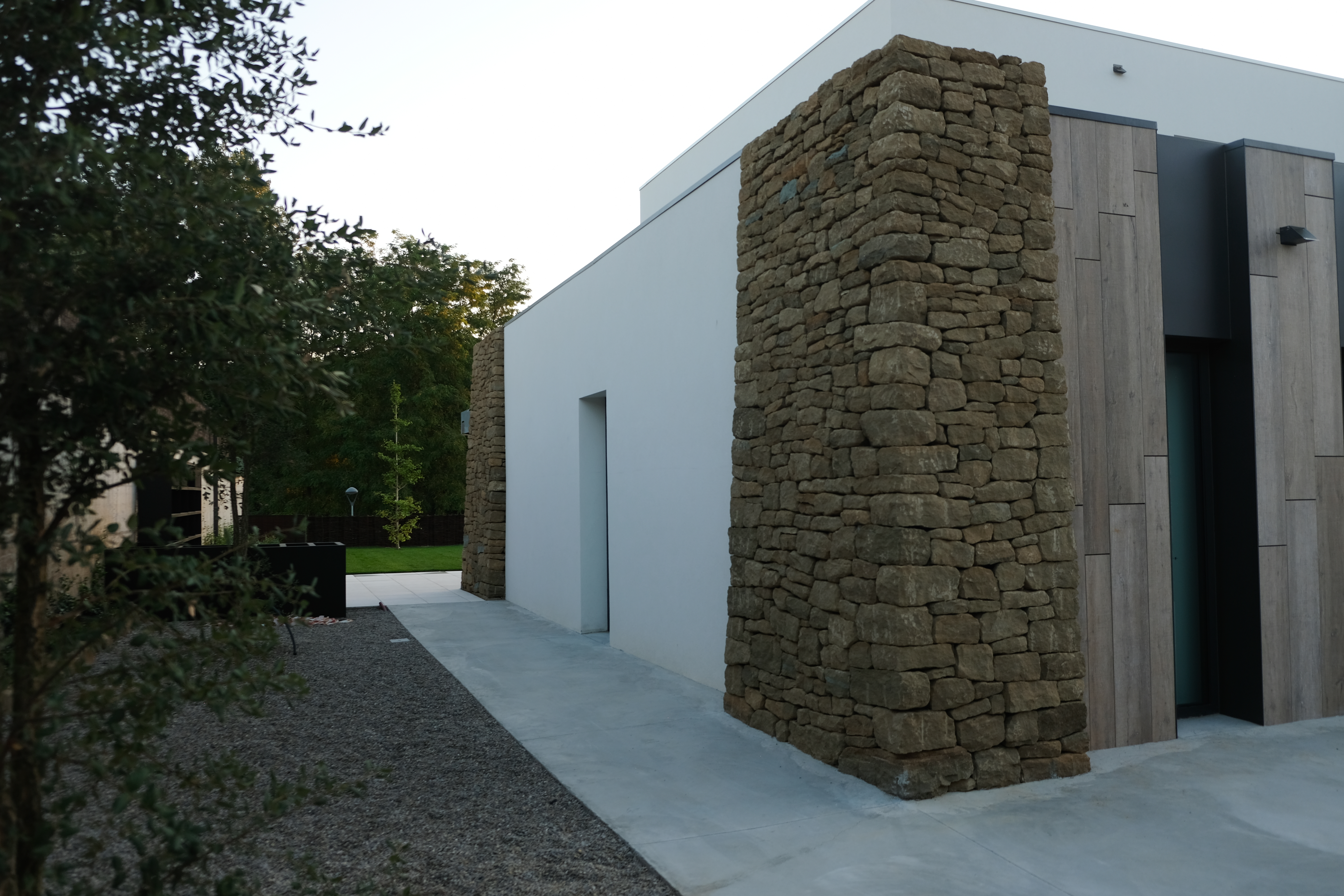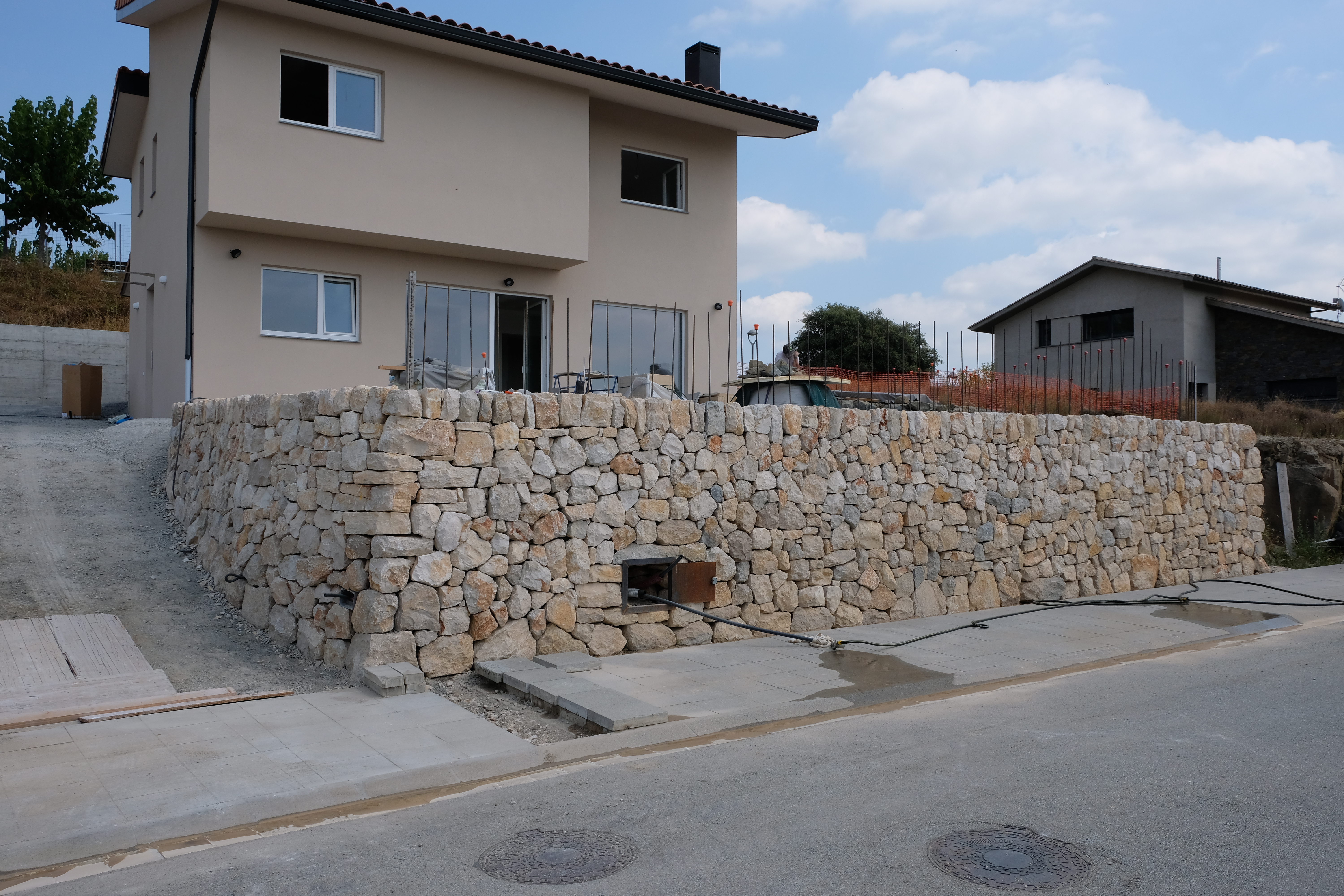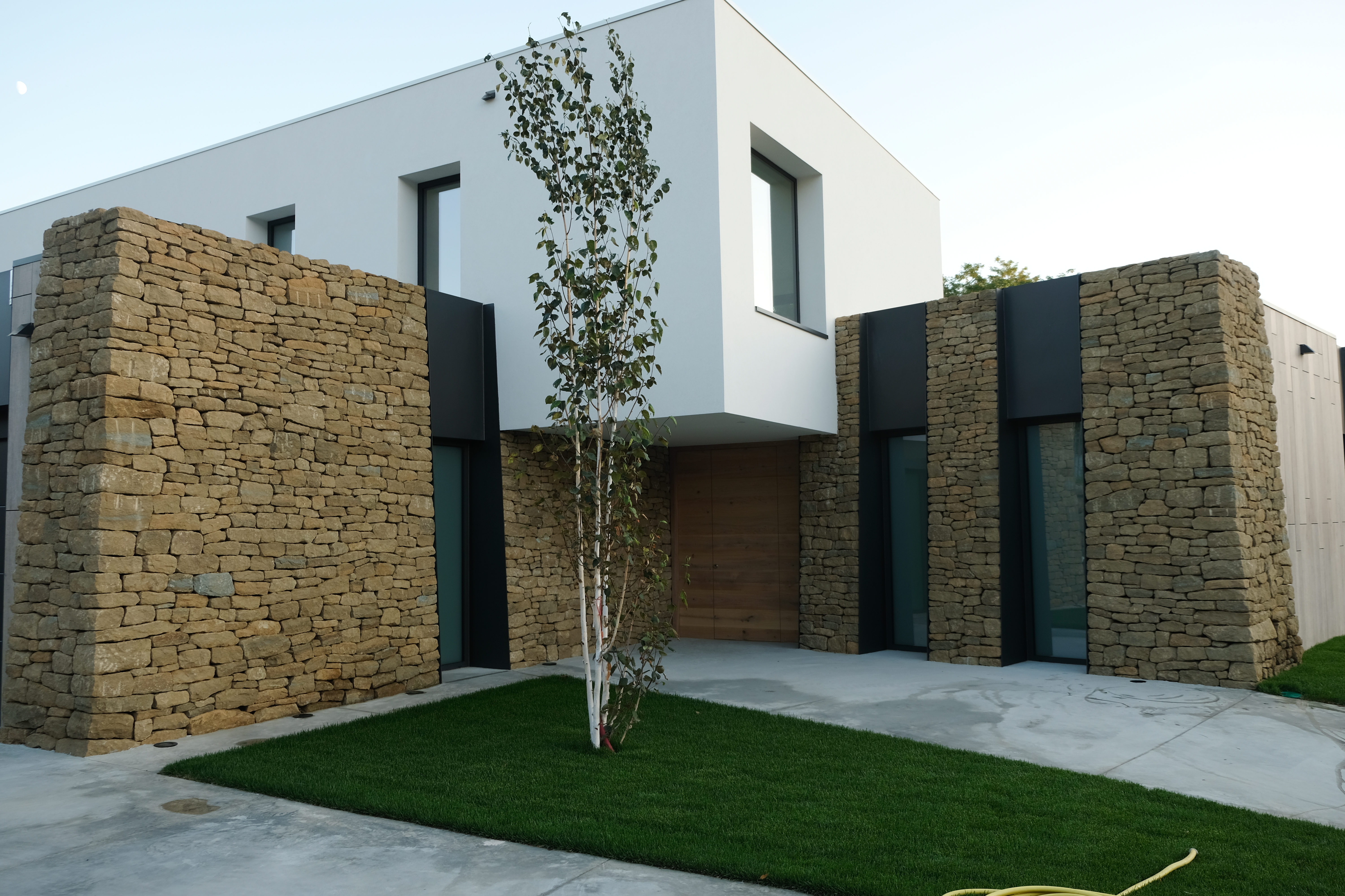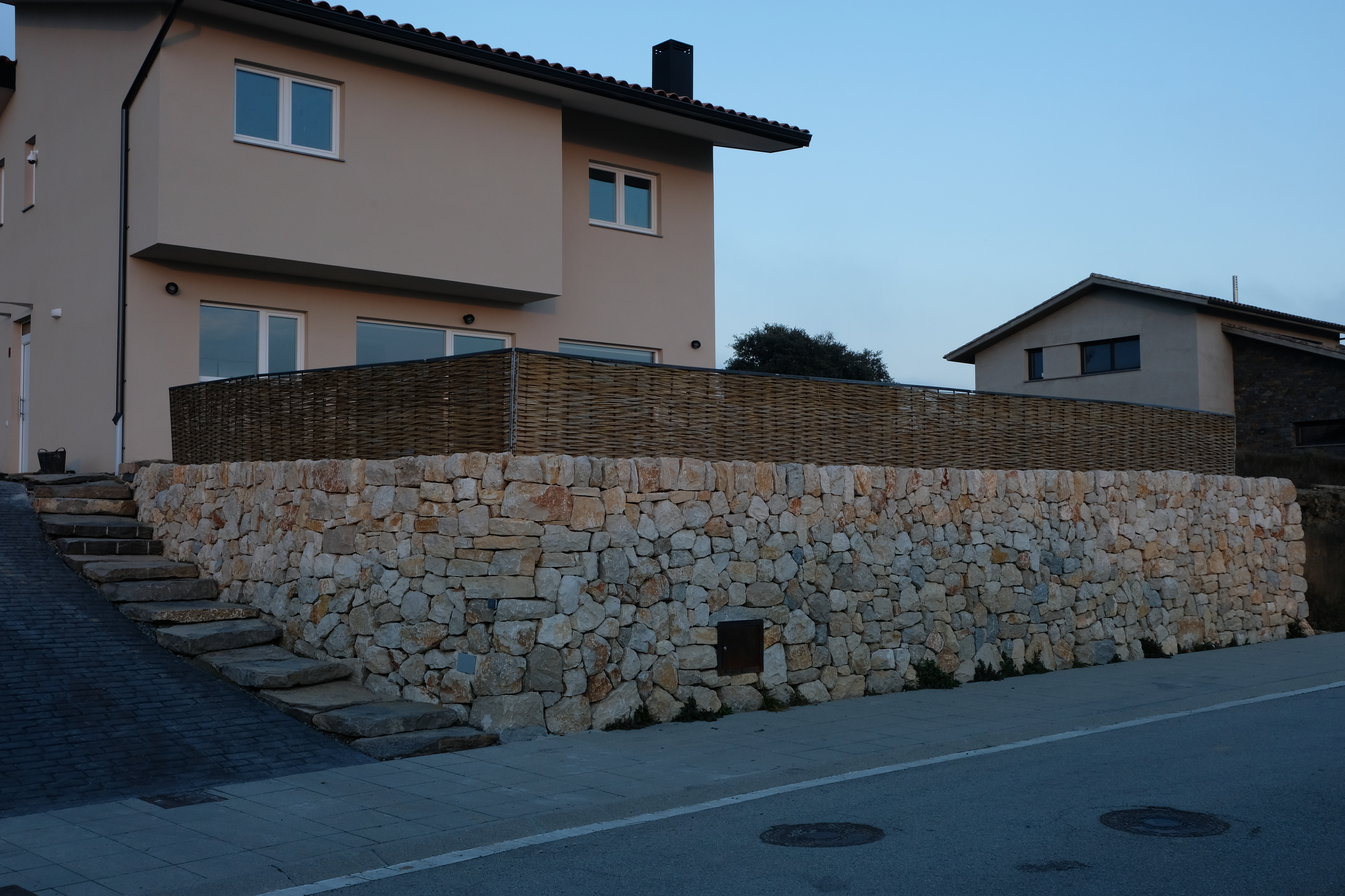 Obra feta a Osona. Amb gresos de “Folgueroles” extrets de la mateixa vila. Un altre cop recobriment d’una façana feta completament en sec amb molt treball de picar pedra.