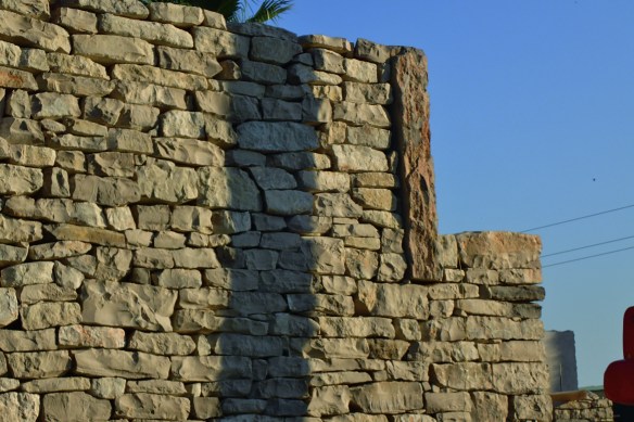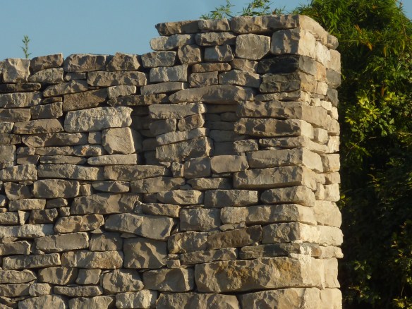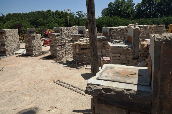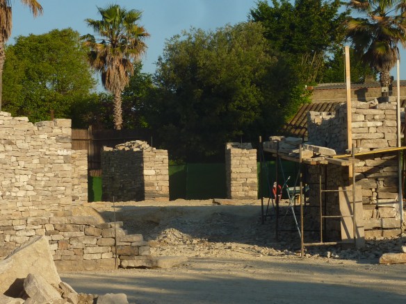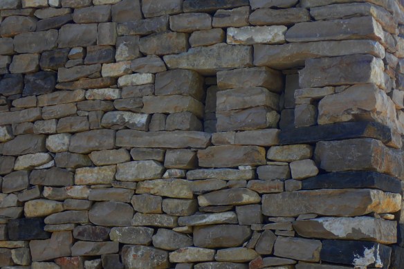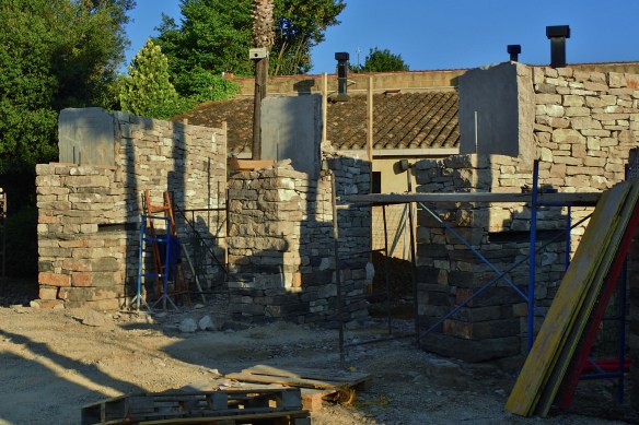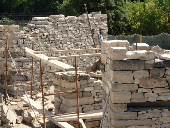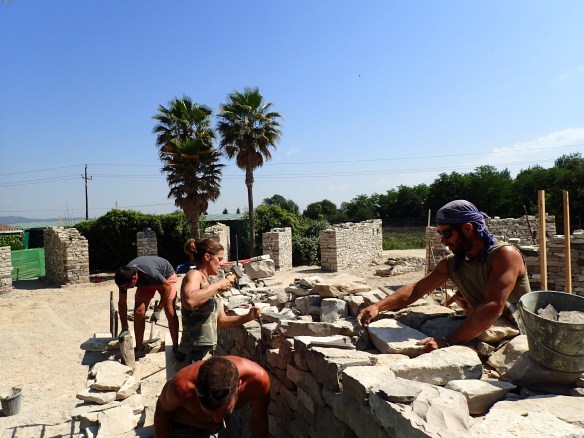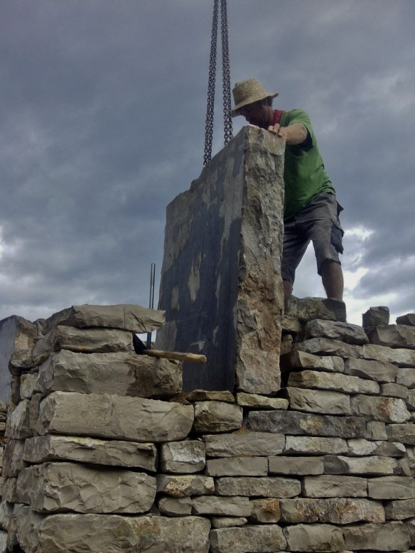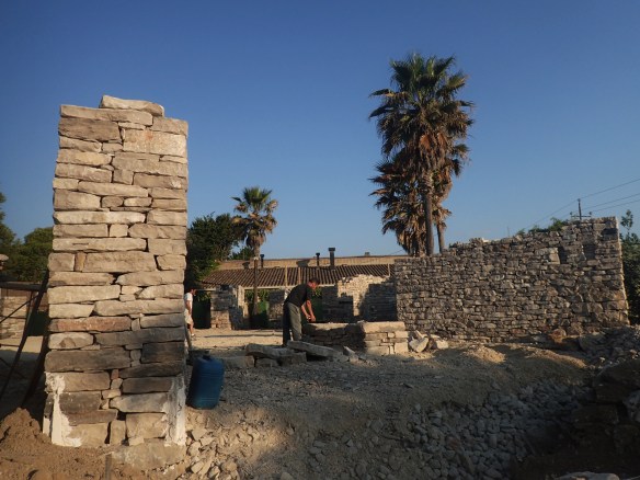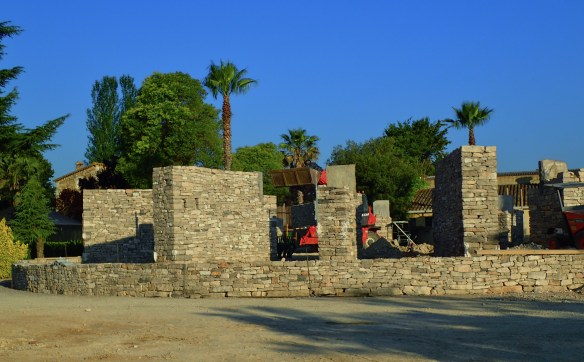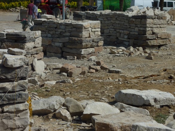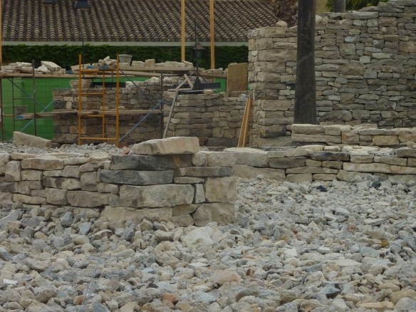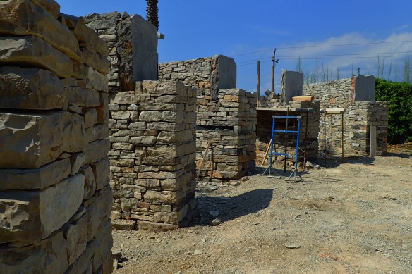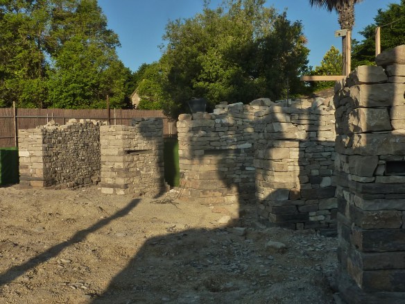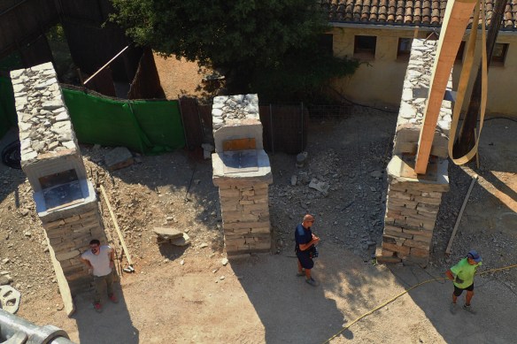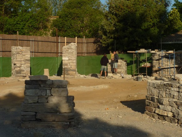 Nou pilars de cinc de llarg per quatre d’alt i nou de dos per quatre, tots d’un metre d’amplada. La pedra escollida, aquest calcari tan plà i rectangular va facilitar molt la feina de fer les moltes cantoneres que teníem, a part dels molts encaixos que teníem a cada pilar per tal de que posteriorment totes les peces que formen aquest projecte anéssin encaixant. Alguns d’aquest pilars gairebé s’han cobert un metre amb graves quan es va aplanar i aixecar tota la zona interior i exterior per obtenir una base plana.