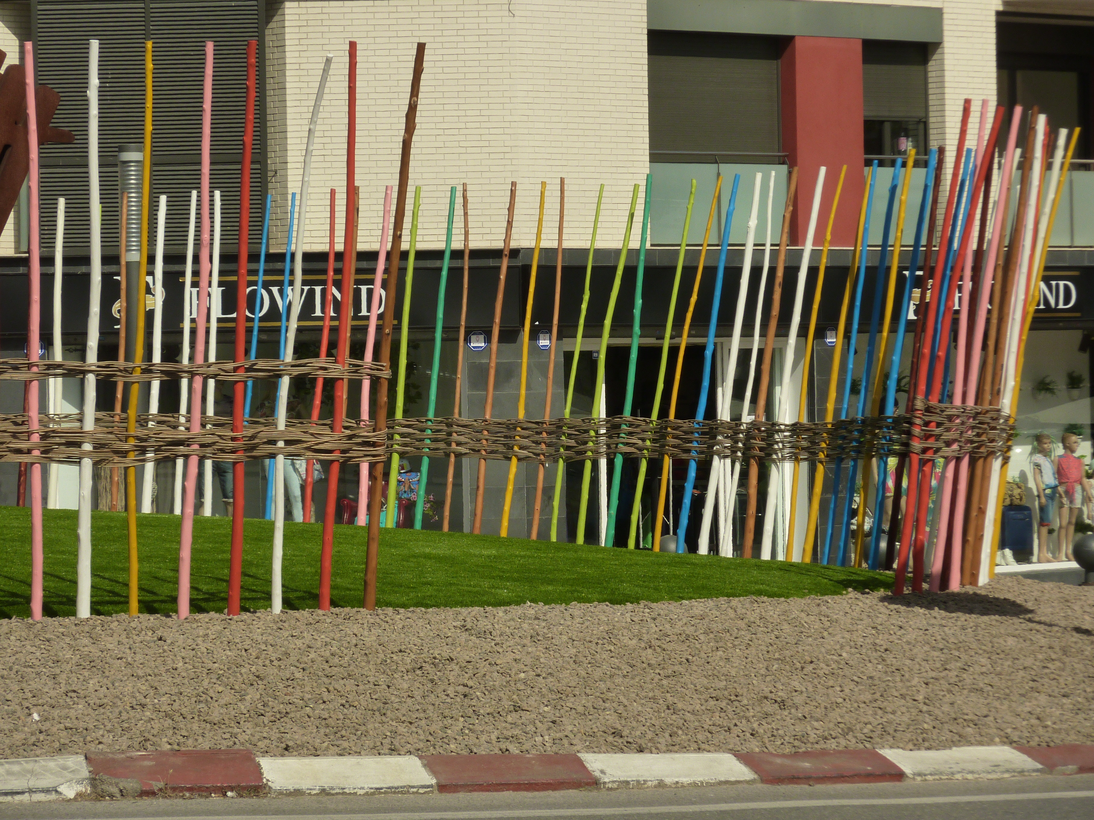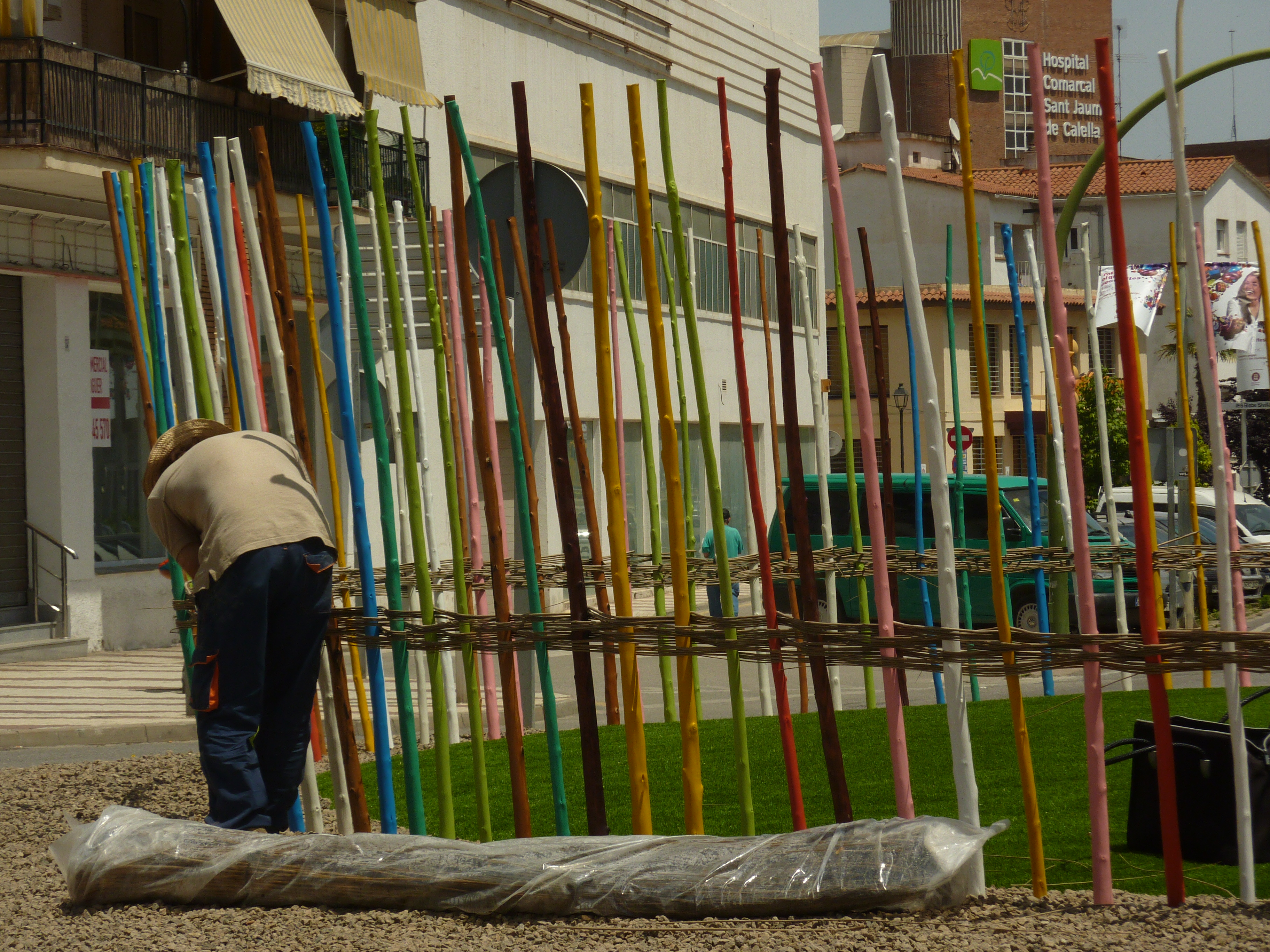Obra feta a Calella de la costa, una mica de vímet pelat i tractat per exterior, trenat al voltant de pals de castanyer pintats. Tot plegat per decorar una rotonda del centre d’aquesta vila del Maresme.