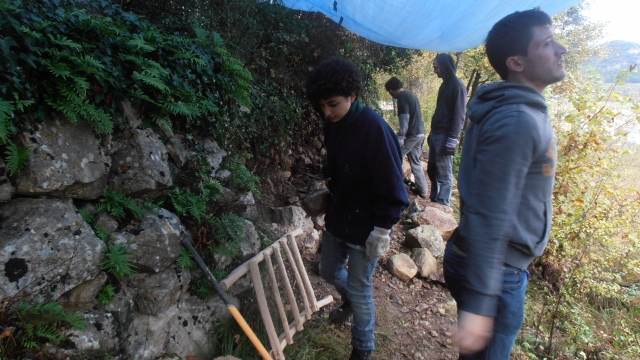 treballant en equip pujant el mur i un toldo per si de cas Published 15 de Desembre de 2013 at 640 × 360 in Cursos de pedra seca a l’escola Orígens de la Garrotxa OLYMPUS DIGITAL CAMERA