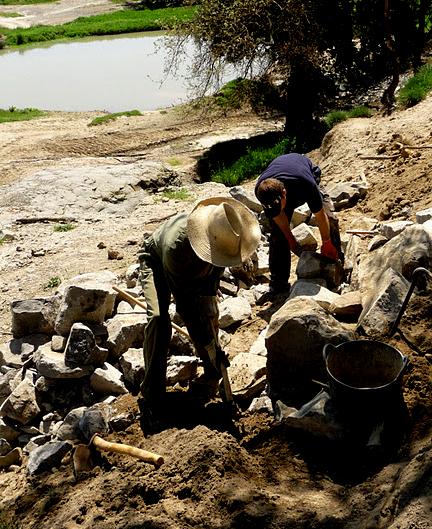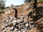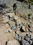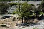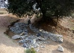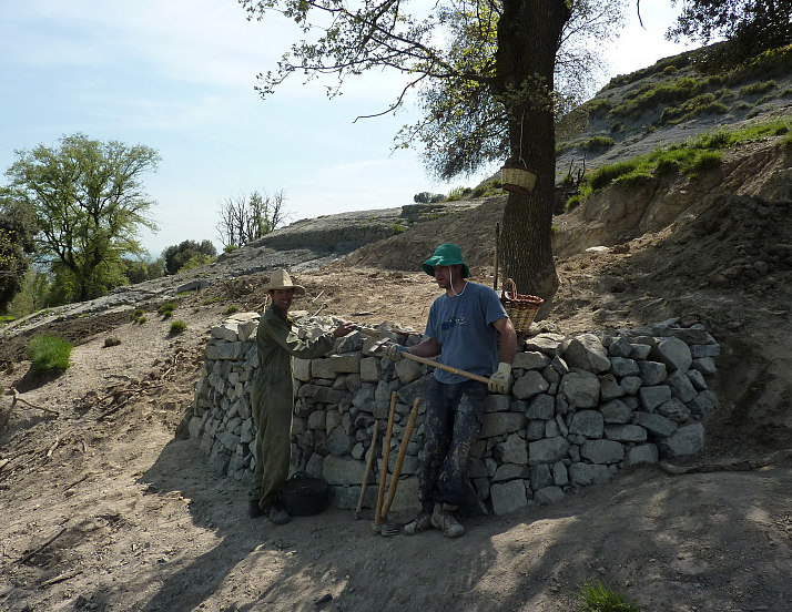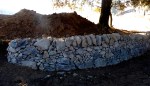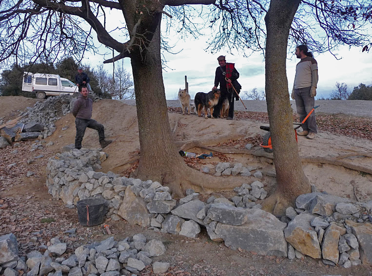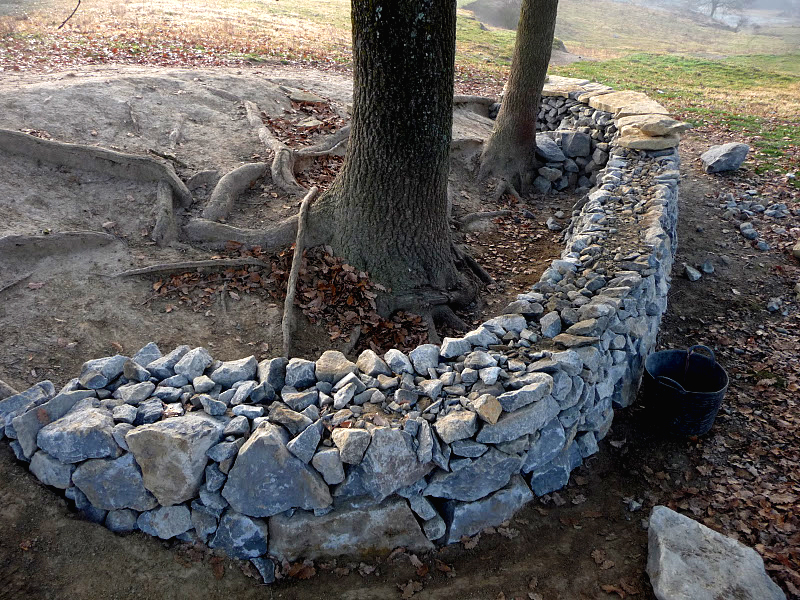 En aquests cas en concret, hem fet uns escossells en una finca de Manlleu, a la Plana de Vic, en uns terrenys que gestionen uns grups de custòdia del territori. Hem optat per a protegir uns quants roures centenaris sobretot de l’erosió i del pas dels ramats d’ovelles i cabres. El primer d’ells, el més alt, està fet amb pedra del terreny, unes margues grises i blavoses típiques de la plana. No són precisament la millos roca per a paredar amb pedra seca però de moment sembla que aguanta bé el pas del temps. De fet, un cop col.locades adequadament, l’erosió que soporten és molt lenta i el que realment els afecta són els hiverns freds. Hem aprofitat l’alçada i la guixària del mur i el reble per incorporar uns caus amb una petita entrada. Volen ser uns nius per a la nombrosa població de mussols de la finca, i segons els biòlegs, aquests caus per sobre el nivell del terra i a recer poden ser uns bons caus per afavorir la cria d’aquesta població. En un altre costat de la finca, a la part de dalt, n’hem fet dos més que protegeixen també uns grans roures. Són més baixets i allargats i per això serveixen com a bancs per a seure a l’ombra pels passejants de la zona. Per això els hem coronat amb lloses planes i grans per poder posar-hi el culs!…