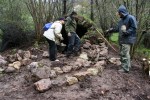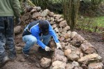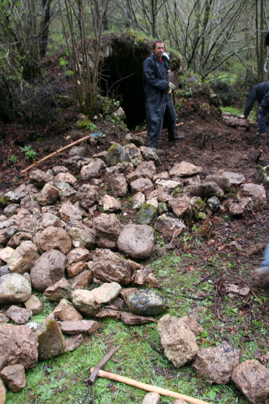 Ara som al Berguedà, a les muntanyes del voltant de La pobla de Lillet, concretament prop del roc de la lluna i del refugi d’Ardericó. Finals de primavera, encara amb un clima força fred i plujós aquell dia. Per tan vam haver d’adaptar una mica la feina a les condicions climatològiques i les condicions del personal. Son auditors, informàtics d’una gran empresa de la capital i per a molts és el primer cop que toquen pedres, no es tracta de forçar-los gaire i per tan farem el que podrem i tenint en compte que fins i tot ens agafa una nevada, ens podem donar com a molt satisfets de la feina feta. A falta de temps per a completar l’obra, ens centrem en fer un mur paravent per la cabana que serveix com a trumfera.
