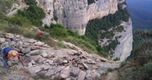 Després de fortes pluges solen passar coses com aquestes: caiguda d’un tram de paret seca. Aquesta paret tan alta ja té un grapat d’anys, i intentem reproduir el mestratge dels margers que la van fer.